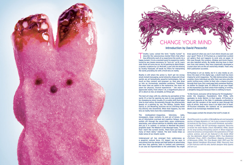 Hi-Fructose began as a quarterly print art magazine, founded by artists Attaboy and Annie Owens in 2005. Hi-Fructose focuses squarely on the art which transcends genre and trend, assuring readers thorough coverage and content that is informative and original. Hi-Fructose showcases an amalgamation of new contemporary, emerging as well distinguished artists, with a spotlight on awe inspiring spectacles from round the world.